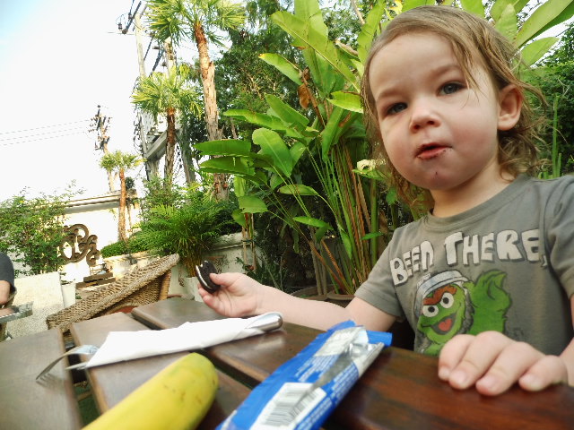 In Chiang Mai werden wir von unseren ersten thailändischen Hosts abgeholt und verbringen die nächsten drei Tage in einem kleinen Ort im Randbezirk von Chiang Mai, eine wahre Oase mit Trinkkokosnüssen im Garten und tollen Geschichten. Ich verliebe mich sofort in die thailändische Gastfreundschaft, erlebe die erste Zerreißprobe als Yanya, unsere Gastgeberin Jannik in der Nachbarschaft rumführt und erst nach einer Stunde zurück kommt. Jannik hält eine Tüte voll mit Süßigkeiten in der Hand und es scheint fast, als hätten alle nur darauf gewartet, dieses arme kleine Kind mit Zucker voll zu pumpen. Ja, das ist Thailand, absolut kinderfreundlich und immer das Bedürfnis, den Kleinsten schon die Welt mit Bonbons zu versüßen. Chiang Mai ist toll, wir besuchen den Zoo, erleben eine sehr lebendige und authentische Gastfreundlichkeit, treffen andere Reisende, erfahren wie gefährlich Roller fahren hier ist und dass ein Unfall den restlichen Urlaub versauen kann, sehen unsere erste tropische Kakerlake und fahren zur Freude von Jannik das erste Mal Tuk Tuk, ein Moped mit überdachter Sitzbank hinten. Den ersten Tag zurück aus der City vergessen wir unseren Ausstieg und landen im Nirgendwo, allein in der Dunkelheit, aber mit Hilfe eines Passanten gelingt es mir, Aatjanee, der Tochter unserer Gastgeberin, unseren Standort mitzuteilen. Heldenhaft rettet sie uns aus unserer Misere.