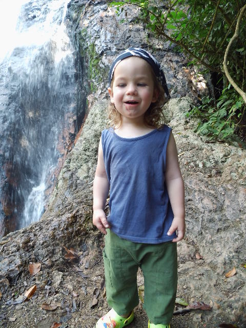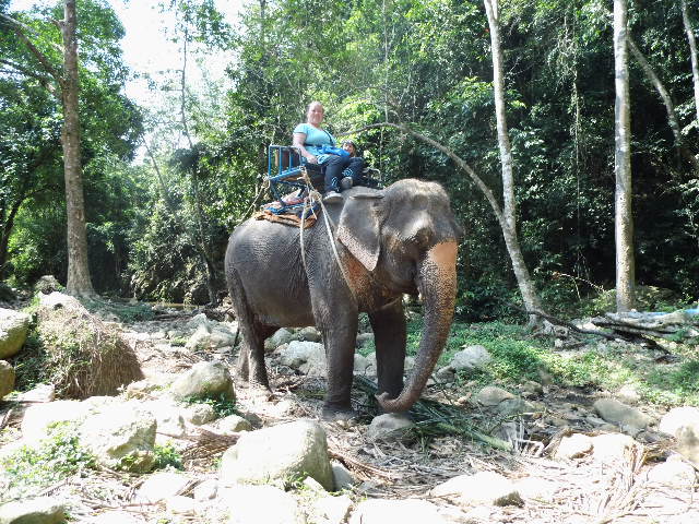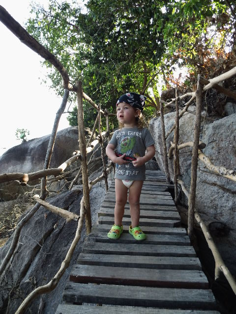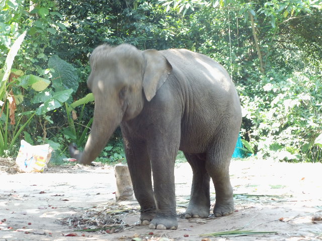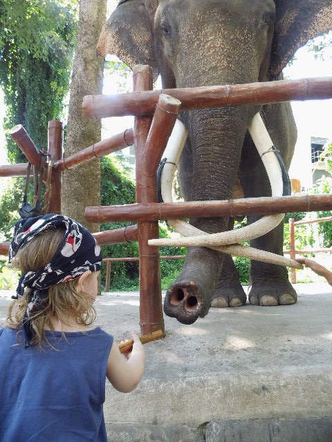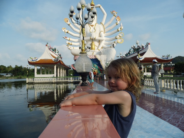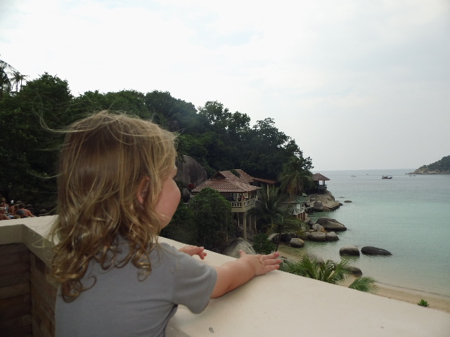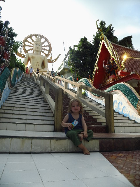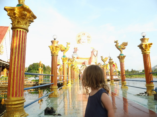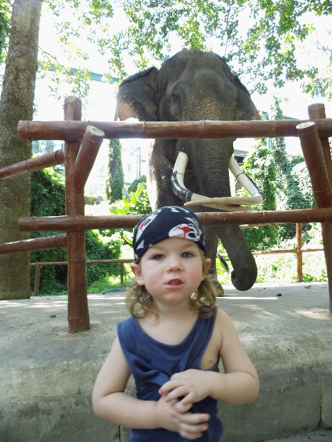 Von Ao Nang buchen wir einen Touristenmassentransport nach Koh Samoui als Komplettpaket. Und es ist wirklich ein Massentransport, jeder bekommt einen Sticker mit Destination aufs Shirt und wir werden an verschieden Stops ausgeladen und wieder eingesammelt, auf typisch thailändischer Weise. Die Fähre hat fast 4 Stunden Verspätung, was aufgrund der Hitze und dem kleinen Sonnendach am Anleger zur absoluten Zerreißprobe wird, hinzu kommen die Strassenhunde, die auf Jannik eine anziehende Wirkung haben, aber so rein gar nichts mit seinen Kuscheltieren gemein haben. Durch die Verspätung kommen wir erst im Dunkeln auf Koh Samoui an und ich entscheide mich dazu, das erste Mal den Dienst eines “Schleppers” in Anspruch zu nehmen, statt selbst eine Unterkunft zu suchen. Wir landen in einem kleinen Zimmer mit Bad und Wc auf der Etage, einem fast abfallenden Deckenventilator, dafür aber mit 200 Baht sehr kostengünstig. Noch vor Sonnenaufgang checken wir aus, bahnen uns den Weg auf die andere Seite der Insel und machen uns auf die Suche nach einer Unterkunft. Wir besuchen Big Buddha, Wat Plai Laem und machen unseren ersten Dschungel Trek inklusive Elefantenritt. Auch wenn ich persönlich mich überhaupt nicht wohl fühle auf dem armen Tier und es auch nie wieder tun würde, ist es für Jannik eine einmalige Erfahrung, an die er sich heute noch erinnert und voller Stolz die Bilder anschaut.