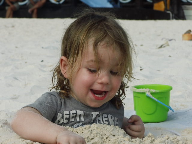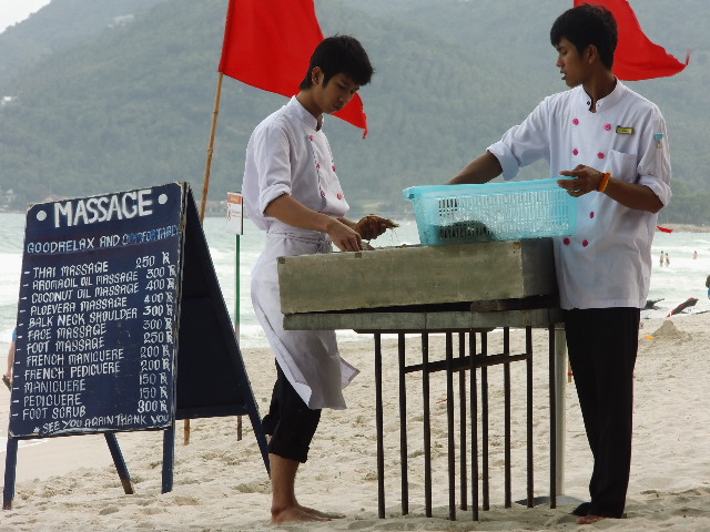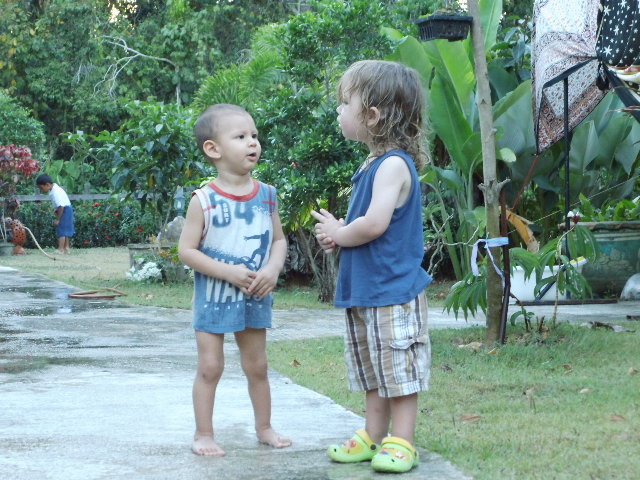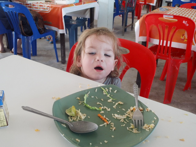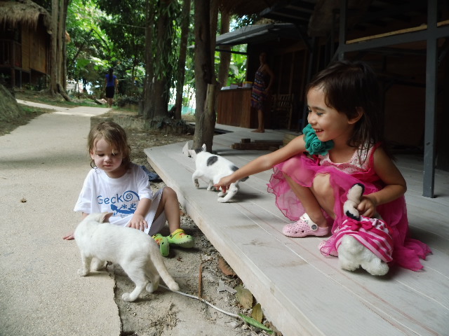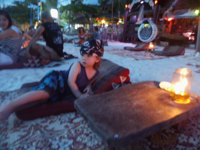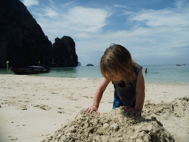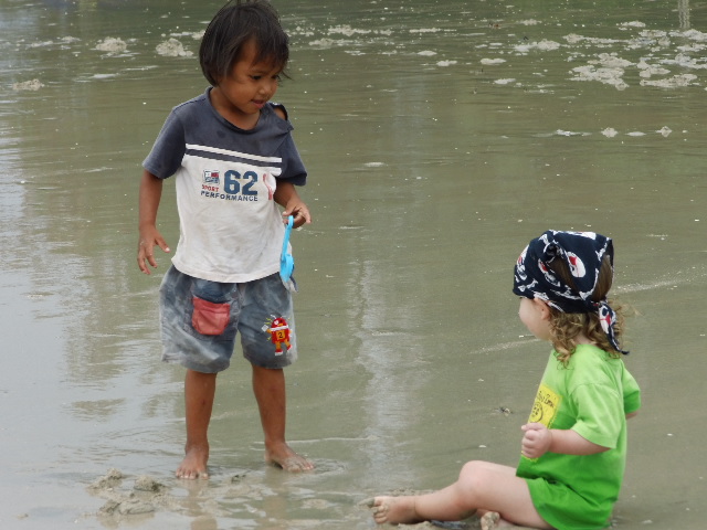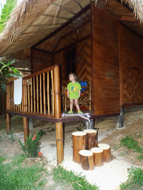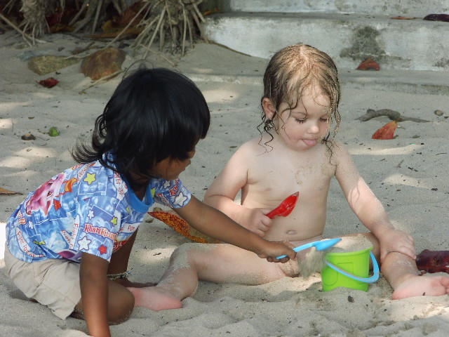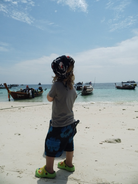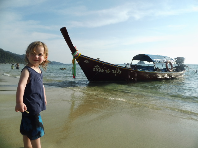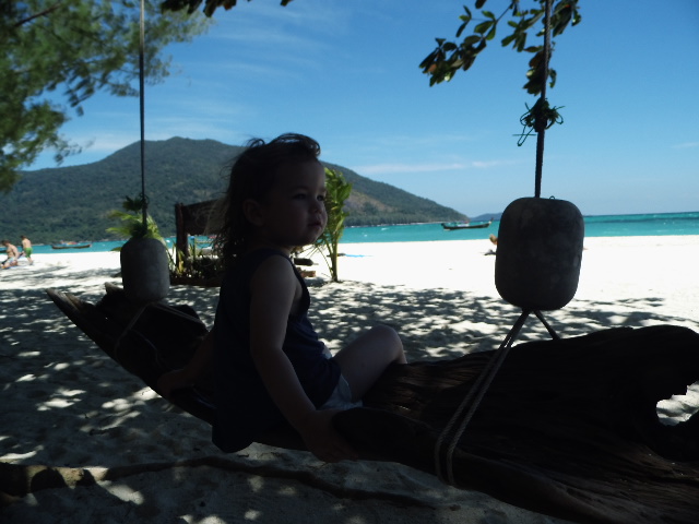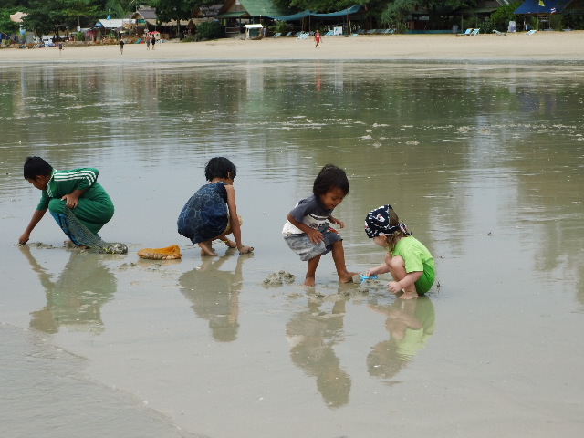Nach drei Tagen gehts weiter mit der Fähre nach Koh Lanta für 450 Baht (11 Euro). Wir machen Halt an kleinen wundervollen Inseln wie zB Koh Muk und ich beschließe, wenn ich mal mehr Zeit habe, möchte ich jede dieser kleinen Inseln kennen lernen. Auf Koh Lanta machen wir uns erstmal auf die Suche nach einer Unterkunft, leider in der Hauptsaison, was es sehr schwierig gestaltet. Nach etlichen erfolglosen Versuchen, suche ich Rat bei einer der vielen Travel Agencies, die mir schon ein wenig Luxus im Khlong Dao Beach Resort für verhältnismäßig wenig Geld (1000 Baht=30 Euro) vermittelt. Wir erhalten dafür Halbpension, direkte tolle Strandlage und ein Haufen deutscher Rentnerpaare, die in Thailand den deutschen Winter überbrücken, zu toppen war die letzte Tatsache nur noch von dem Verhaltenn eines französischen Ehepaares, die das Respektieren fremder Kulturen gänzlich ausblendeten und trotz mehrfachen Hinweises, das Restaurant mit Schuhen betraten, welches sich in Thailand nicht gehört. Aber allein diese herrliche Strandlage reißt alles wieder raus und da ich sonst so günstig reise, kann man sich auch mal drei Nächte Luxus gönnen. Jannik genießt es sehr, beim ersten Sonnenstrahl Eimerchen und Plastiklöffel zu schnappen und den Strand umzubuddeln, bei Ebbe den einheimischen Kindern beim Muscheln sammeln zu helfen und einfach nur Kind zu sein. Koh Lanta ist extrem auf Kinder ausgerichtet, an jedem Strandrestaurant gibt es Spielgeräte wie zB kleine Rutschen oder Schaukel.