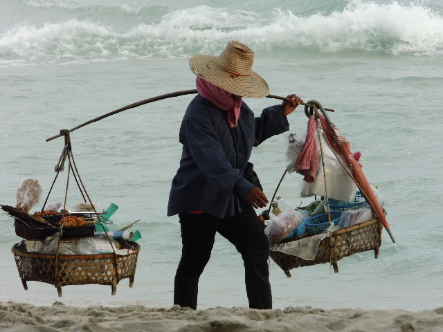 Wir werden auf einem wackeligen Holz-Ponton (einer schwimmenden Landeplattform) abgeladen, da es auf Koh Lipe keinen Anlegeplatz gibt und sofort tummeln sich die Longtailboote um uns herum und sammeln die Touristen für weitere 50 Baht (1,40 Euro) die letzten 100 Meter zum Land ein, dann heißt es Hose hoch krempeln und durchs Wasser stampfen, während Jannik wie ein Päckchen auf den Schultern von einem Seezigeuner getragen wird. Mühsam ziehe ich die Karre durch den Sand und bereue die Mitnahme gerade sehr.