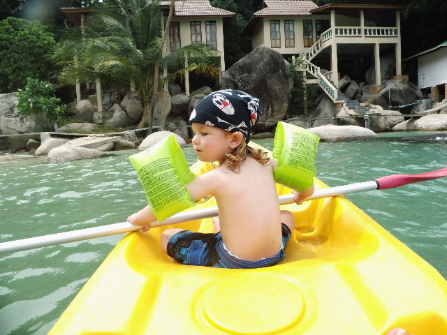 Am nächsten Tag geht es weiter nach Koh Tao, ein El Dorado für Taucher, eine Tauchschule neben der anderen, viele Backpacker und Langzeitreisende und alle mit der Idee, den Tauhlehrerschein zu machen, um sich den Traum von einem Leben im Paradies zu erfüllen. Koh Tao bedeutet übersetzt Schildkröteninsel. Tatsächlich verliebe ich mich auch ein wenig in diese kleine tropische Insel mit ihren palmengesäumten Stränden. Wir finden eine Bungalowanlage abseits von all den Tauchschulen, auf einem kleinen Berg gelegen und mit einer tollen Badebucht für Jannik. Nachts jagen uns die Geckos mit ihren Lauten etwas Angst an der Hauswand unseres Bungalows ein, aber beruhigen tut uns immer wieder das Meeresrauschen. Wir genießen die letzten Tage auf Koh Tao bevor es wieder Richtung Bangkok geht. Einfach nur am Strand sein, schwimmen, mit dem Kajak Richtung offenes Meer fahren, die Felsen erklimmen, Einsiedlerkrebse beobachten, den Zikaden lauschen, all das erleben wir hier noch einmal in einer Leidenschaft aus einfach nur sein. Jannik singt einen Abend das Lied “i follow” und löst einen regelrechten Flashmop damit aus, der noch bis zum Frühstück anhält, so dass der Kellner ihn singend und schmunzelnd zum Frühstück empfängt. Wir lernen daraufhin noch ein deutsches Pärchen kennen und verbringen den letzten Tag und die Fährüberfahrt nach Chumphorn miteinander, wo unser Nachtzug nach Bangkok fährt.