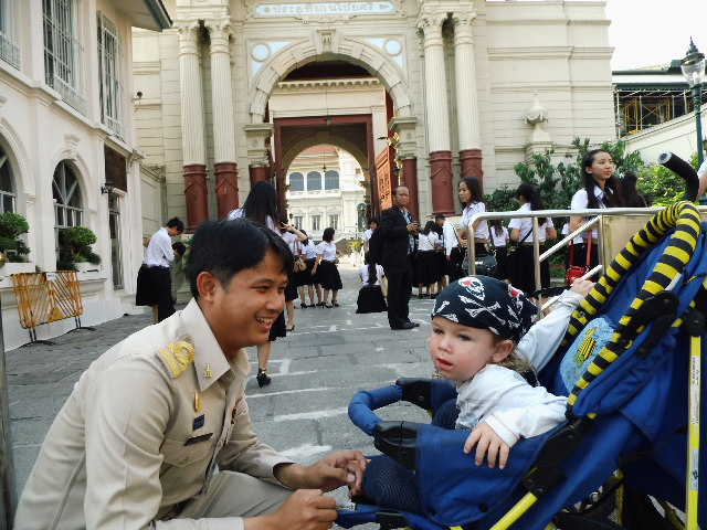 Es macht sich ein wenig Wehmut breit, ahne ich doch, dass unser Trip in zwei Tagen zu Ende geht. Wir erreichen Bangkok am frühen Morgen und ich plane mir den Tag in der Stadt ein, gebe unser Gepäck in die Verwahrungsstelle und mache mich auf den Weg zum Palast, verschiedenen Tempelanlagen, Spielplätze und Märkte. Der Smog steht in der Luft und ich spüre diese besonders dünne Luft, die mir ein wenig die Kraft raubt. Die letzten zwei Tage verbringen wir bei einer absolut tollen Gastgeberin aus Amerika mit einer kleinen Tochter, die nur 2 Jahre älter als Jannik ist und auch noch deutsch spricht. Wir radeln zu ihrer Schule, um uns eine Aufführung anzuschauen, spazieren durch die Siedlung, füttern Fische und lassen die letzten 4 Wochen noch einmal Revue passieren.