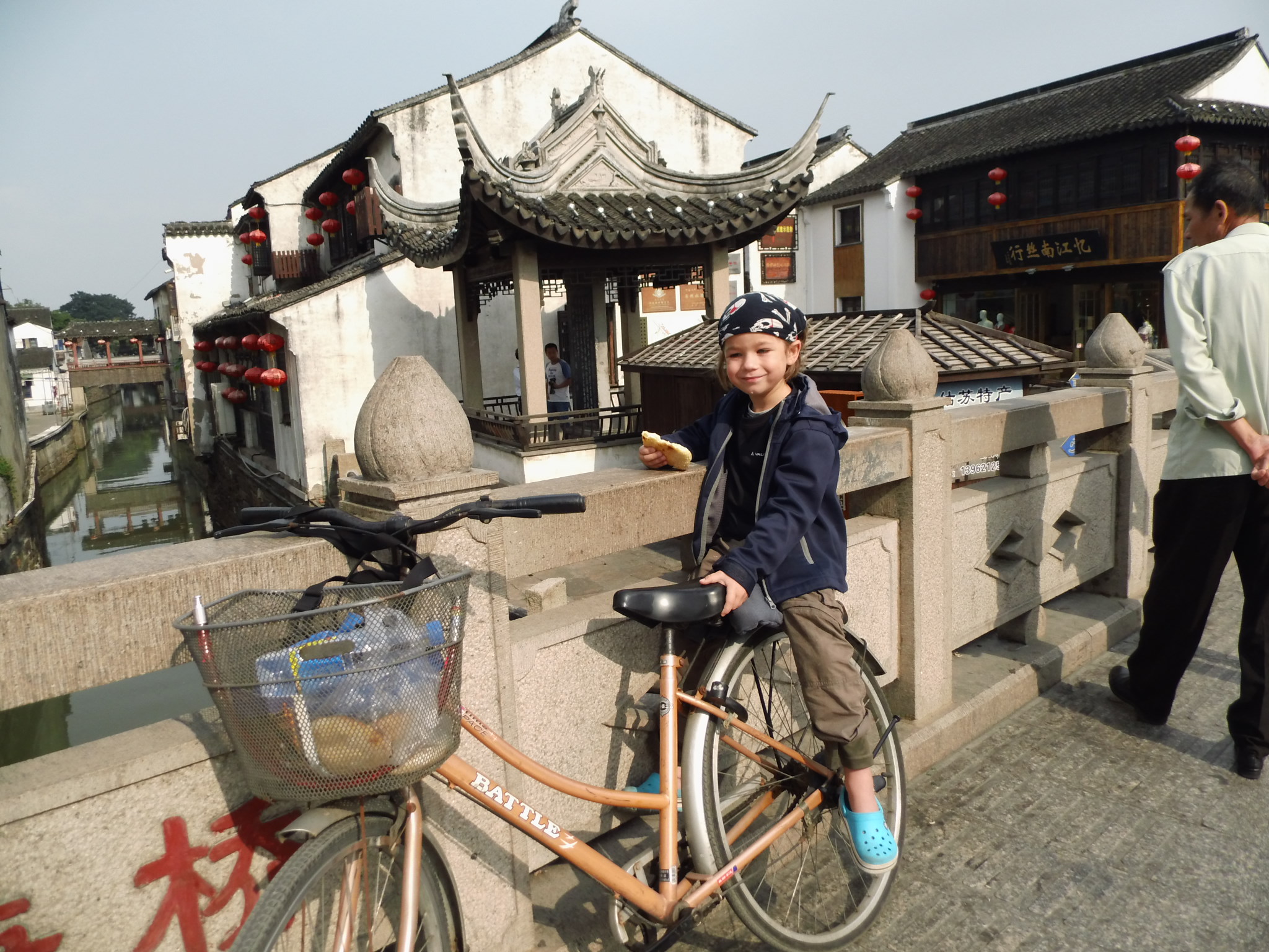 Am nächsten Tag tuen wir das, was uns am meisten Spaß macht, wir radeln durch die Stadt und vergessen das geschäftigte Treiben von Shanghai. Ich merke wie gut uns das tut nach all dem Trubel der letzten zweiundhalb Wochen. Jannik erlebt seine erste Fahrt auf dem Gepäckträger und ist stolz wie Oskar mit mir wie die Einheimischen die Straßen unsicher zu machen. Ich habe heute das Gefühl, ganz chinesisch zu sein. Zwar besuchen wir eine Attraktion, nämlich den historischen Stadtkern von Suzhou, aber am Ende fahren wir einfach nur planlos durch die Gegend und lassen uns von Verkehrsfluss treiben. Unsere größte Herausforderung ist das Linksabbiegen, das ist die Königsdisziplin des Radfahrens in China. Denn man tut es gleichzeitig mit den Rechtsabbiegern der gegenüberliegenden Seite und überfährt die Fußgänger, denn die Hierarchie im Straßenverkehr ist hier eine andere und da stehen Fußgänger ganz unten in der Kette. Was für Jannik ein Riesenspaß ist, treibt mir den Schweiß ins Gesicht. Von links und rechts überholt, hoffe ich, dass mir die Fußgänger ausweichen und alles geht gut. Nach drei Linksabbiegungen dieser Art bin ich schon fast ein Profi 😉
