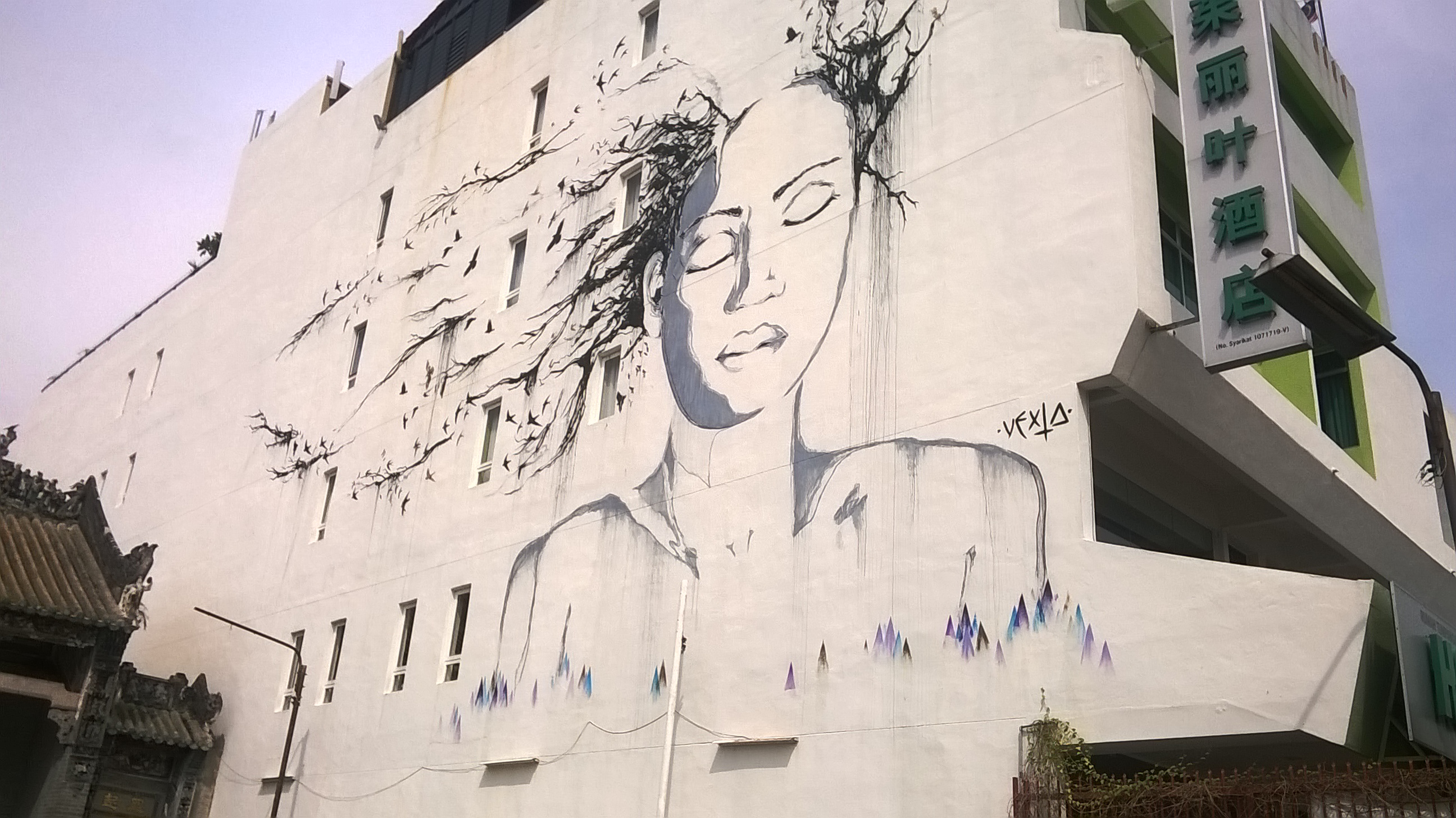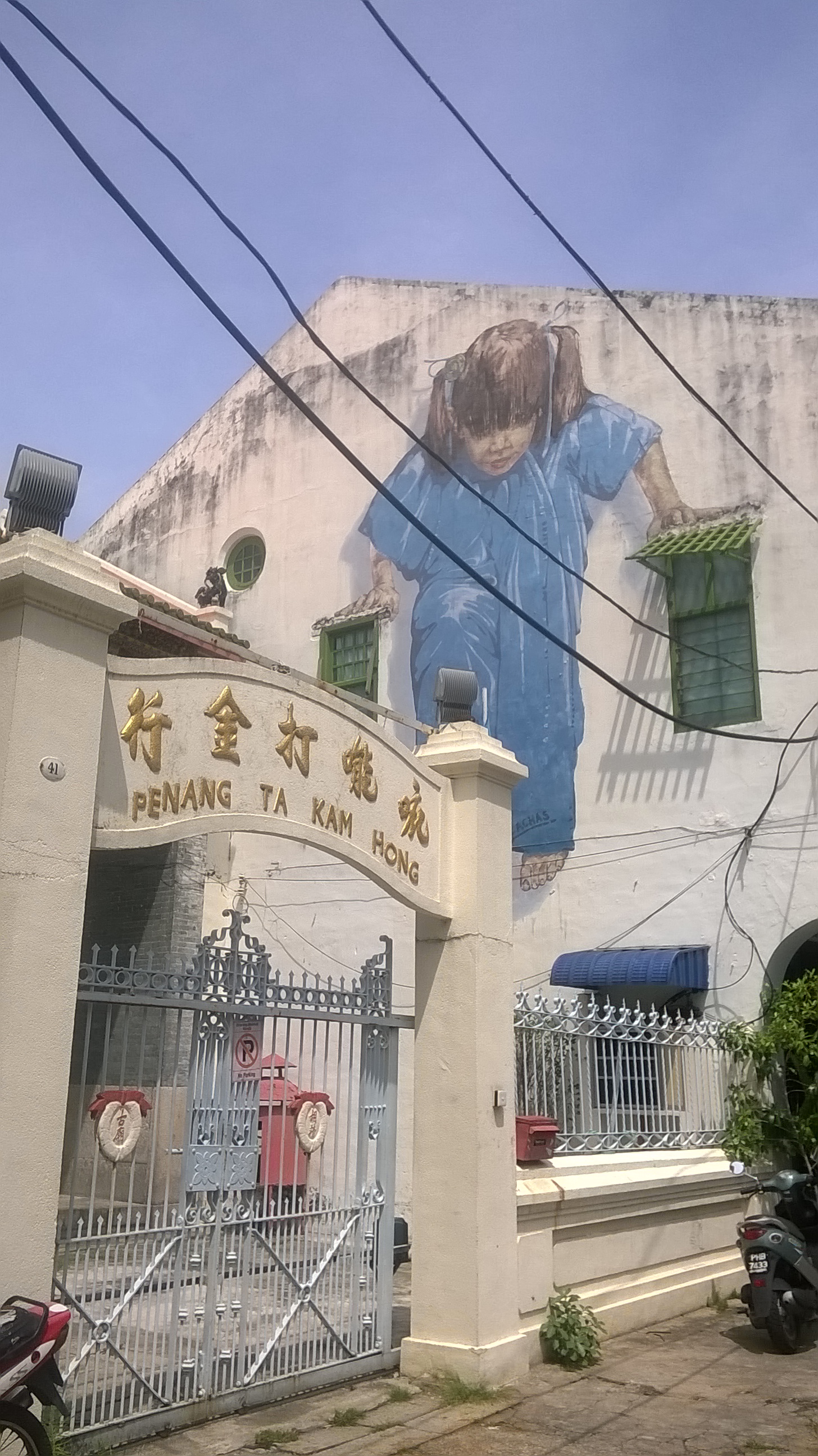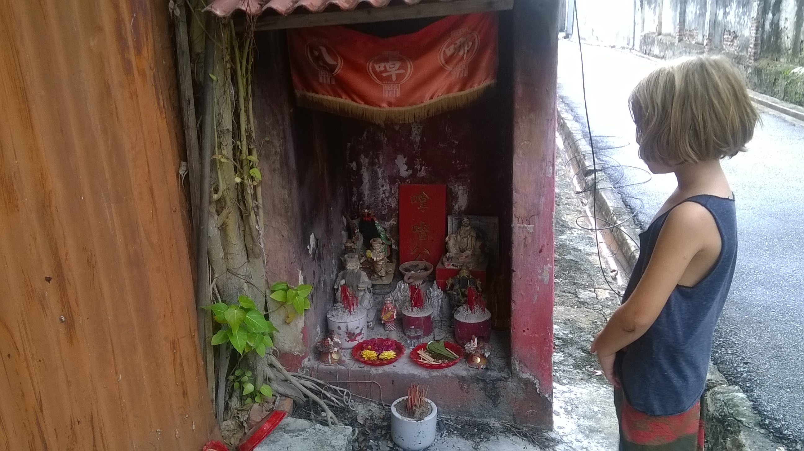 Wir machen uns die nächsten Tage daran, die historische Altstadt zu bestaunen. Einen Rundgang der legendären Streetart findest du bei Francis und Bina von my-road. Eine Karte zu den besonderen Wandmalereien bekommst du fast an jeder Ecke in den Hostels oder Souvenirshops. Und für Kinder ist das Entdecken und Suchen der vielen Kunstwerke eine spannende kleine Jagd. Die Fotos, die daraus entstehen haben einen ganz speziellen Charme, den ich zuvor nirgends anders erlebt habe. Ich persönlich stehe total auf die alten Gebäude, die kleinen chinesischen Geschäftshäuser geben sich mit den alten bunten Kolonialwerken die Hand. Viele Tempel mit unterschiedlich religiösen Hintergründen und alte Moscheen säumen quasi die ganze Insel und ganz besonders zu erwähnen ist das gute Essen auf Penang. Die unterschiedlichsten Nationen finden in Georgetown ihren Platz und alles fühlt sich harmonisch an. Little India gefällt uns besonders gut, die laute Musik, die fröhlichen Menschen, Gold und Glitzer und der Kokosnussverkäufer auf seiner Rikscher…..fast könnte man glauben, man sei in Indien und ich spüre eine mir ganz neue Sehnsucht nach dem fernen Indien. Anders als man mir es zuvor gesagt hatte, empfinde ich gerade hier, auf Penang die moslemsiche Kultur als extrem offen und tolerant. Überall versprüht es Leichtigkeit und Weltoffenheit. Es gefällt mir hier sehr.