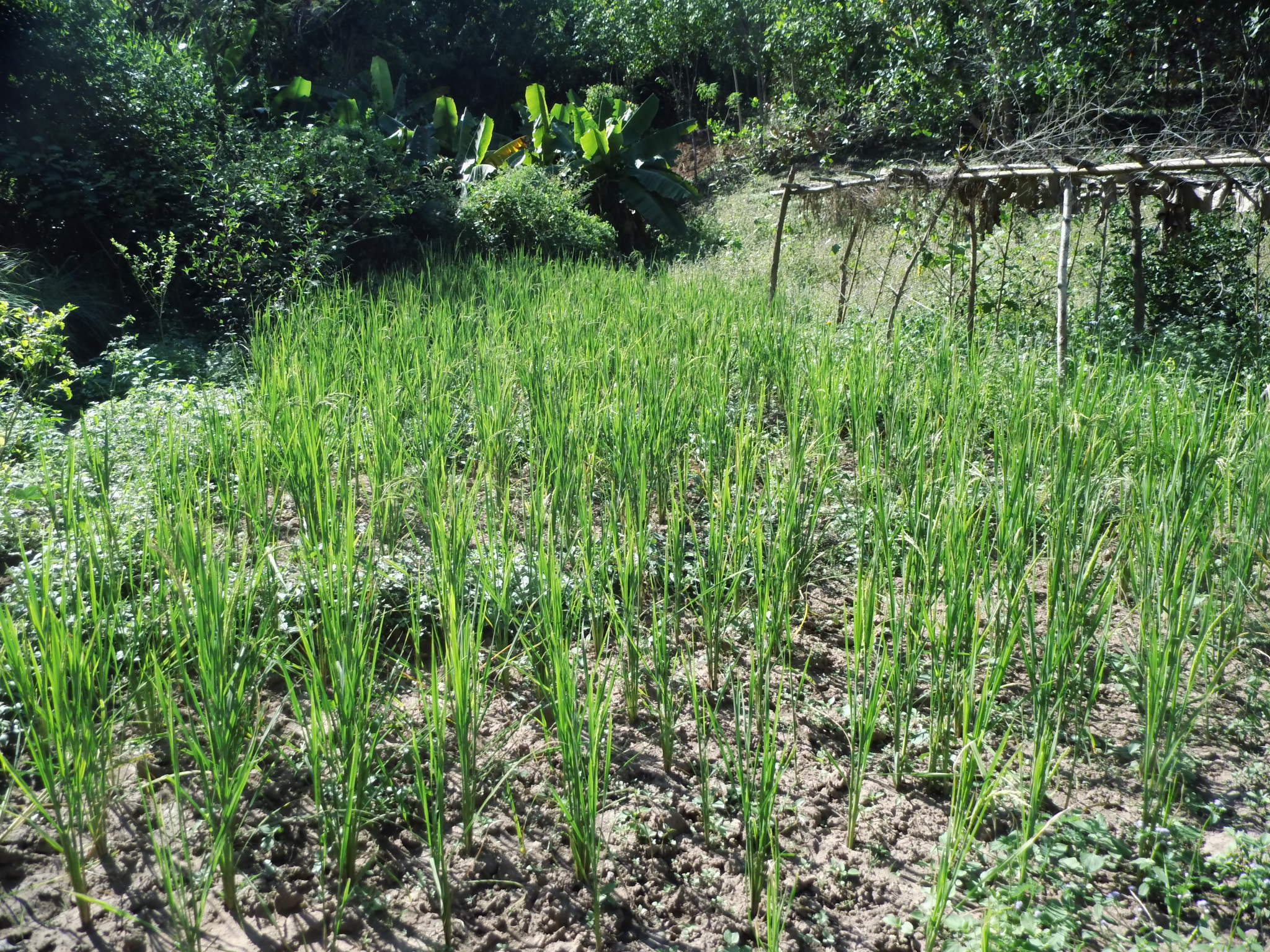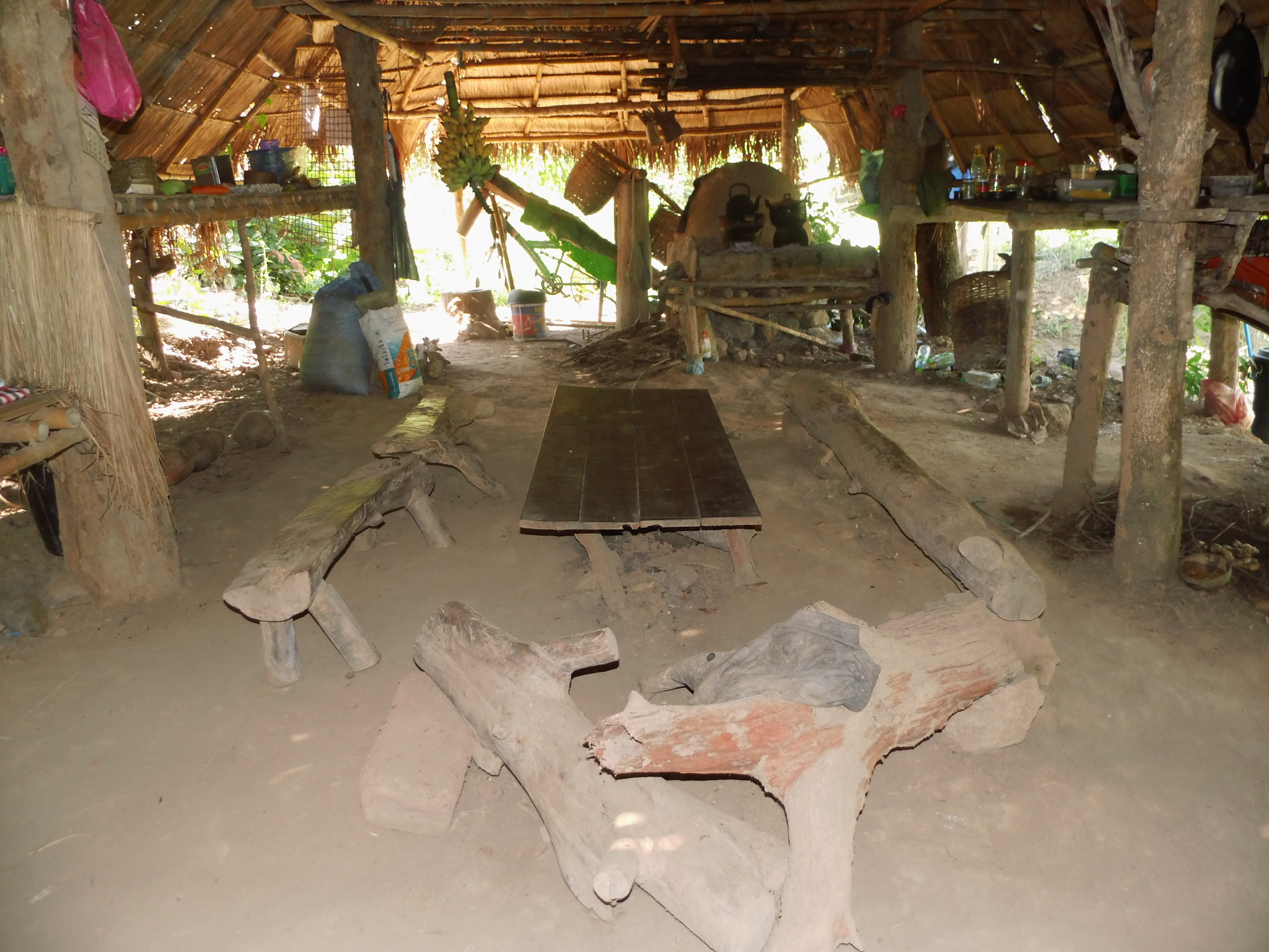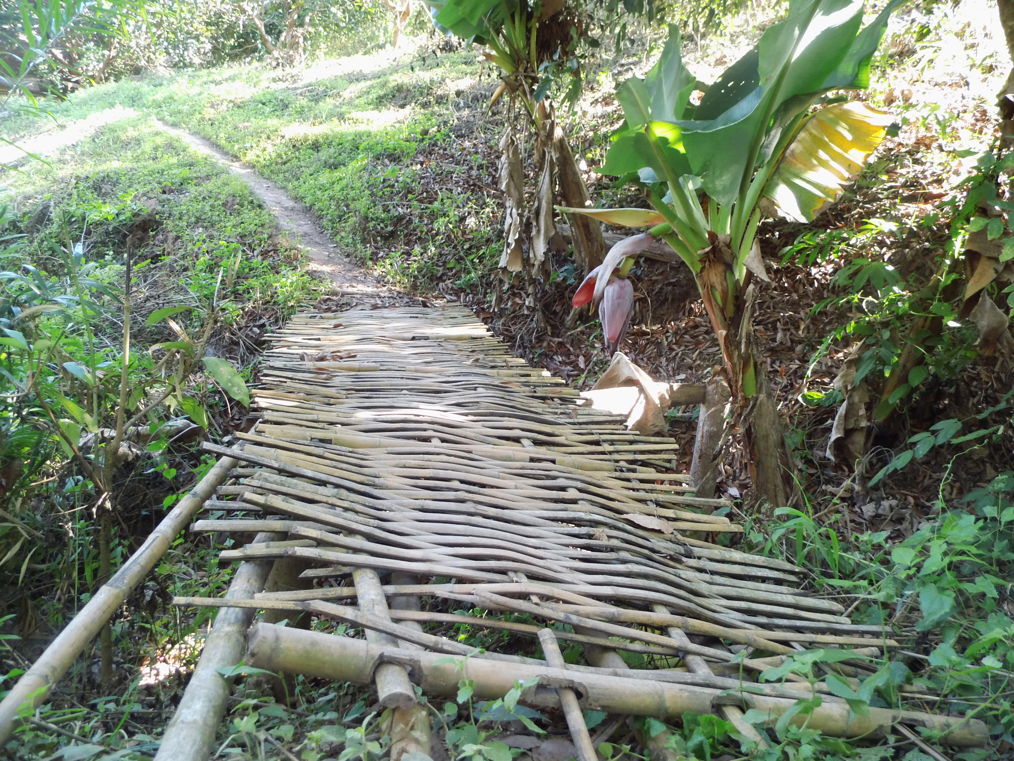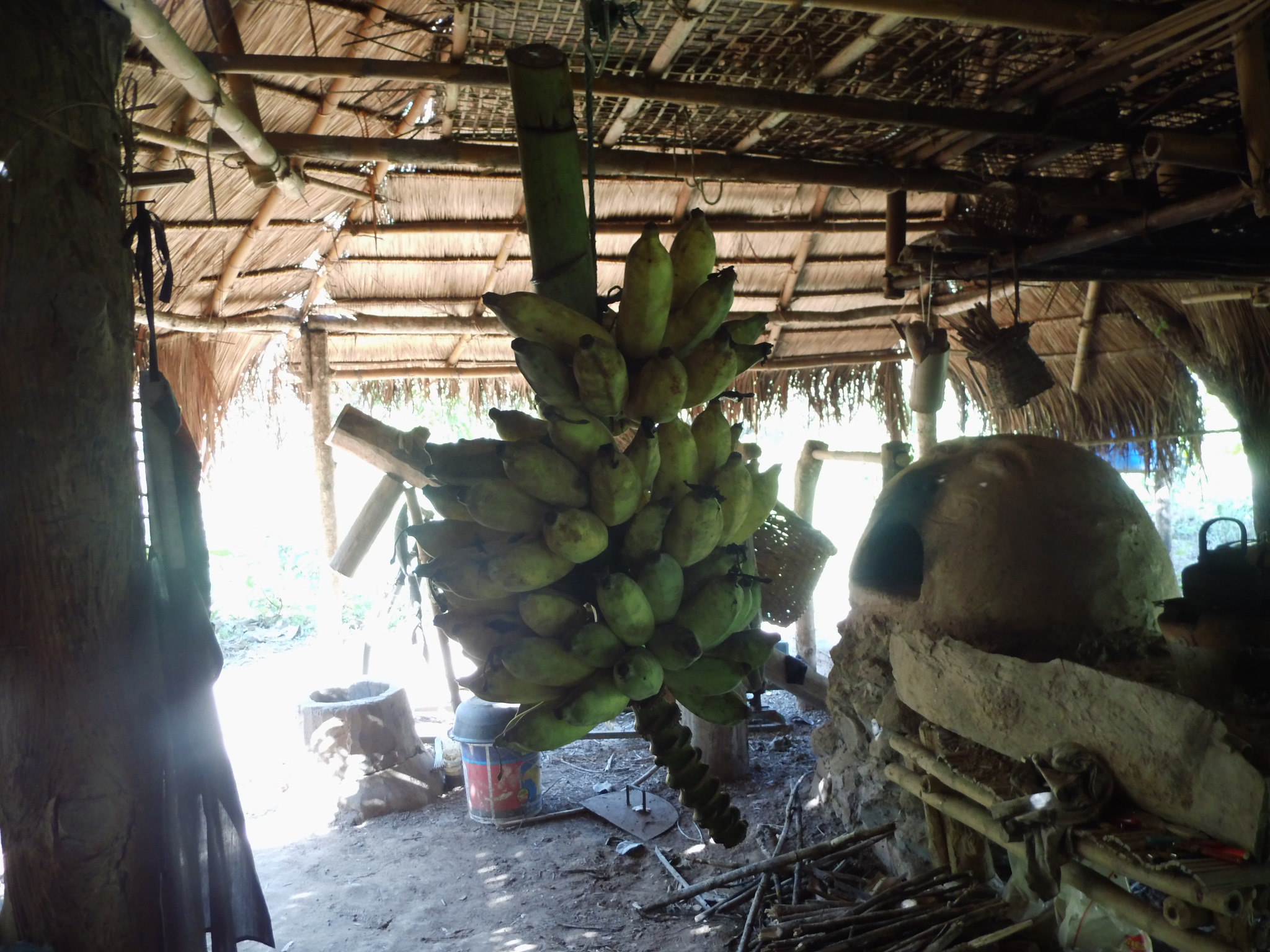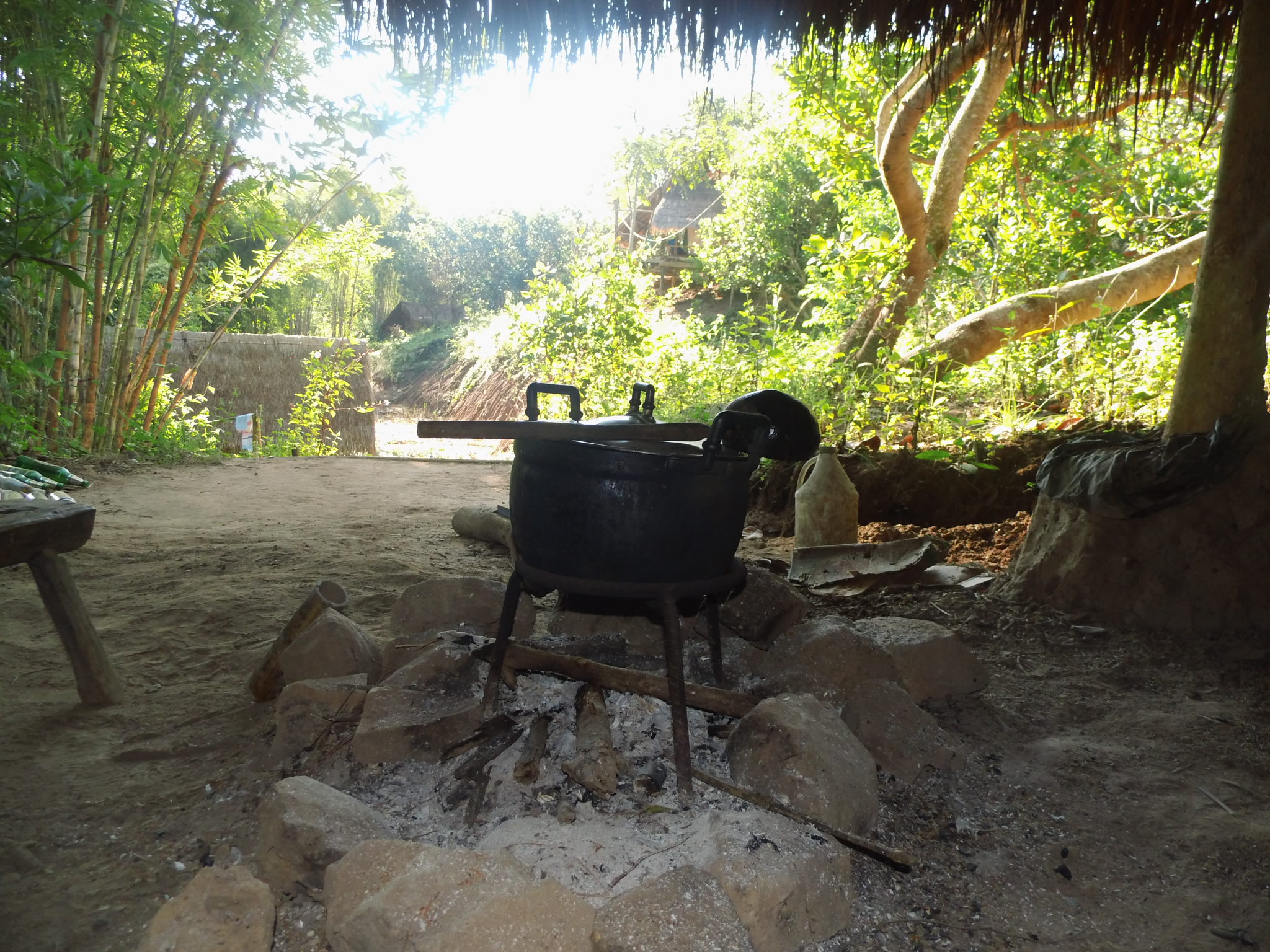 Wir werden von den gerade zwei einzigen Gästen auf der Sahai Nan Farm, einer Japanerin und einer Amerikanerin und einem unglaublichen Sternenhimmel, begrüßt. Ich habe niemals in meinem Leben eine so unglaublich schönen Sternenhimmel gesehen. Als ich den Gemeinschaftsbereich betrete, fühle ich mich ein Stück in die Steinzeit zurück versetzt. Feuerstellen, Kokusnussschalen und Bambuslöffel. Ich fühle mich grad so wohl, dass ich kaum Worte dafür finde. Und auch für Jannik ist das alles hier wahnsinnig spannend und allein der Ritt auf dem Motorroller schlägt noch euphorische Wellen. Als Sandot dann noch seine Gitarre raus holt und wir gemeinsam unterm Sternhimmel sitzen, ist es endgültig um mich geschehen. Ich habe mich in dieses kleine Paradies mitten im Dschungel verliebt, ohne es überhaupt bei Tageslicht gesehen zu haben. Wir schlafen in wirklich einfachen Behausungen auf Bambus und Matratzen, unterm Moskitonetz und nur Dach aus Stroh und wir lieben es beide. Für Jannik ist das alles hier ein wirklich großes Abenteuer. Der nächste Tag bestätigt nur mein Gefühl, was ich von diesem einzigartigen Ort habe, es ist tatsächlich ein kleines Paradies. Kleine Felder, ein Teich, viele Bananenbäume und gänzliche Ruhe.