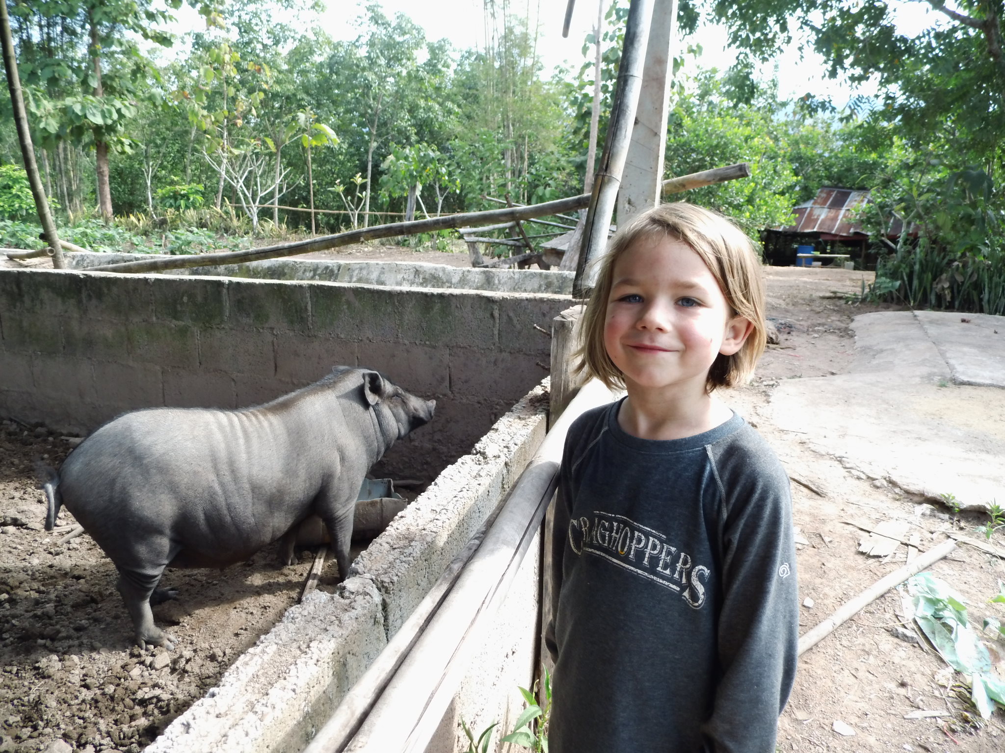 die beiden Jungs haben nach einigen Tagen einen Zugang zueinander gefunden. Als wir die Schule besuchten, war er in erster Linie an dem Spielzeug des Kindergartens interessiert 😉 wir haben immer mal wieder Auseinandersetzungen, die aber mit der Zeit immer besser werden. Die Turbulenzen der letzten Monate haben bei beiden von uns Spuren hinterlassen. Und ja, er aergerte die Katze. Langeweile trat bei ihm meistens dann auf, wenn das Essen noch 10 Minuten brauchte. Ich muss aber generell sagen, dass er mit der Zeit auch trotz des wenigen englischs eine gute Möglichkeit gefunden hat, mit allen zu kommunizieren. Fazit, es gibt für Kinder jede Menge auf der Farm. Die Kunst ist, ihnen immer wieder abwechslungsreiche Beschäftigungen zu geben. Am Ende war er mindestens genau so traurig wie ich, die Farm zu verlassen. Und ganz besonders vermissen wird er Sandot und die Zeit, wo er allein mit ihm auf den Roller in die Ortschaft gefahren ist. Da ist mir erst so richtig bewusst geworden wie wichtig das auch für ihn ist, Zeit ohne Mama zu haben 😉