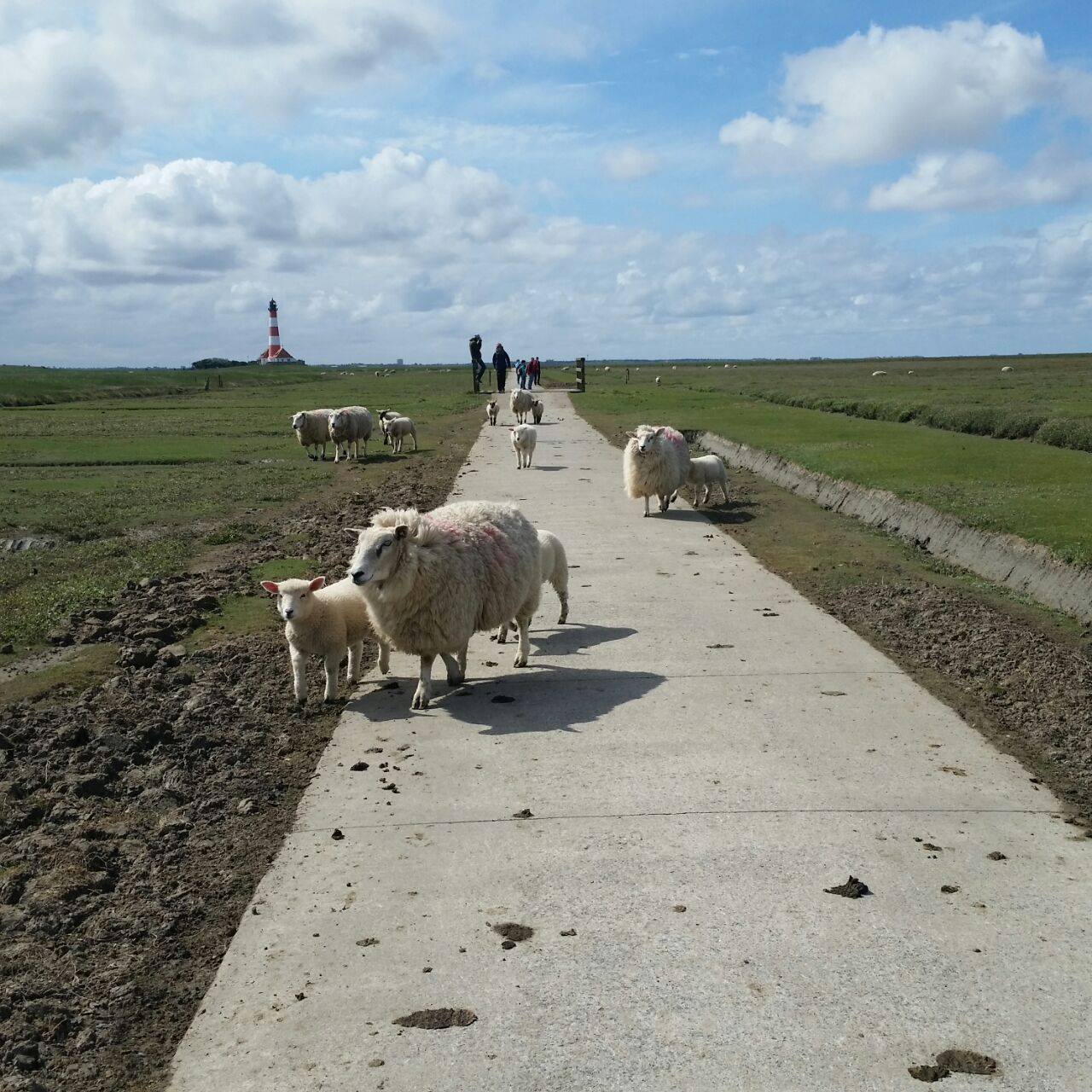 - Unbedingt sehenswert ist ein Marsch zum Westerhever Leuchtturm. Wenn dir die 2,5 km zu weit sind mit Kind, kannst du dir vor Ort entweder ein Rad oder Bollerwagen mieten. Aber Vorsicht, die Deichschafe sind überall 😉