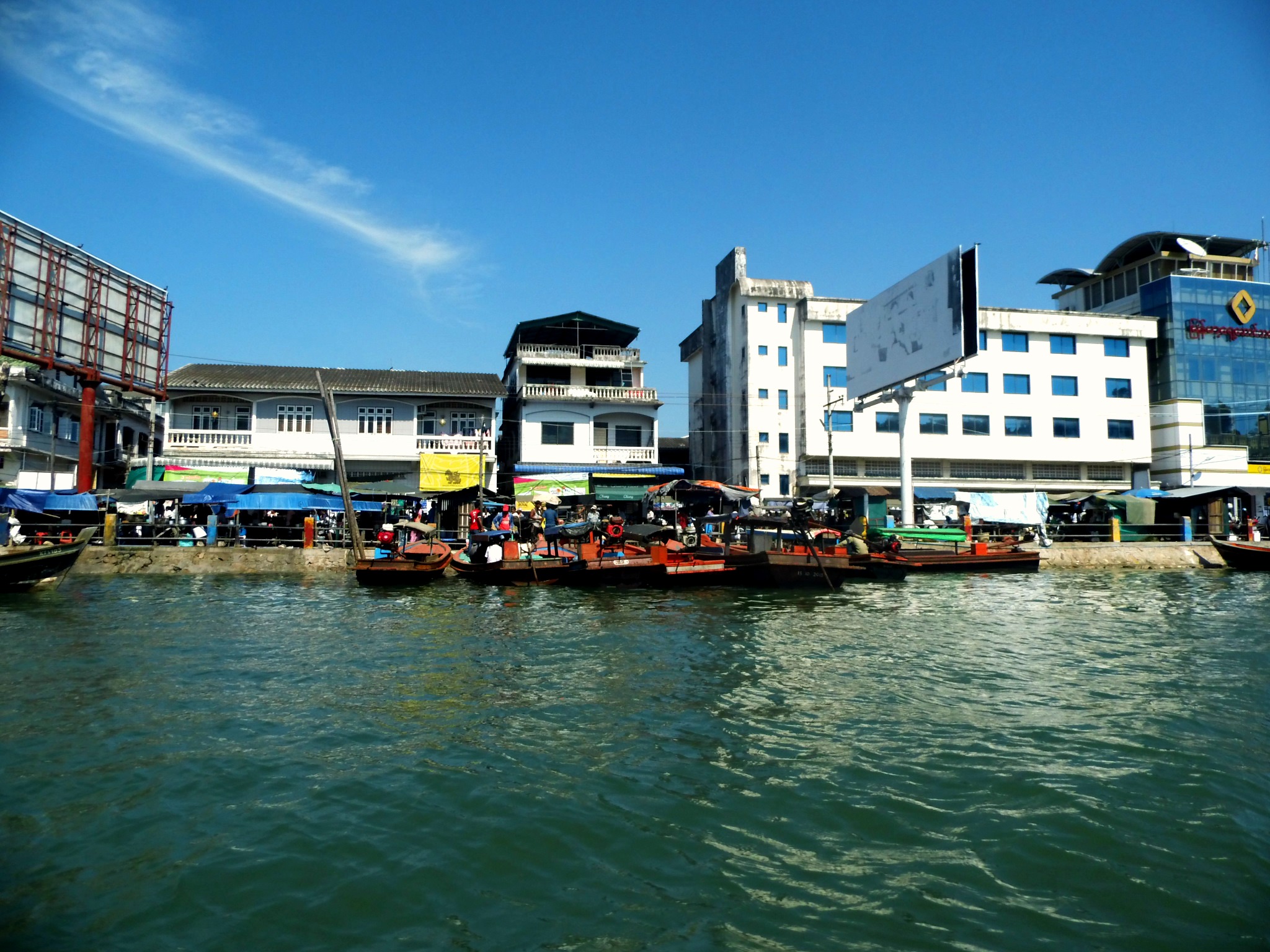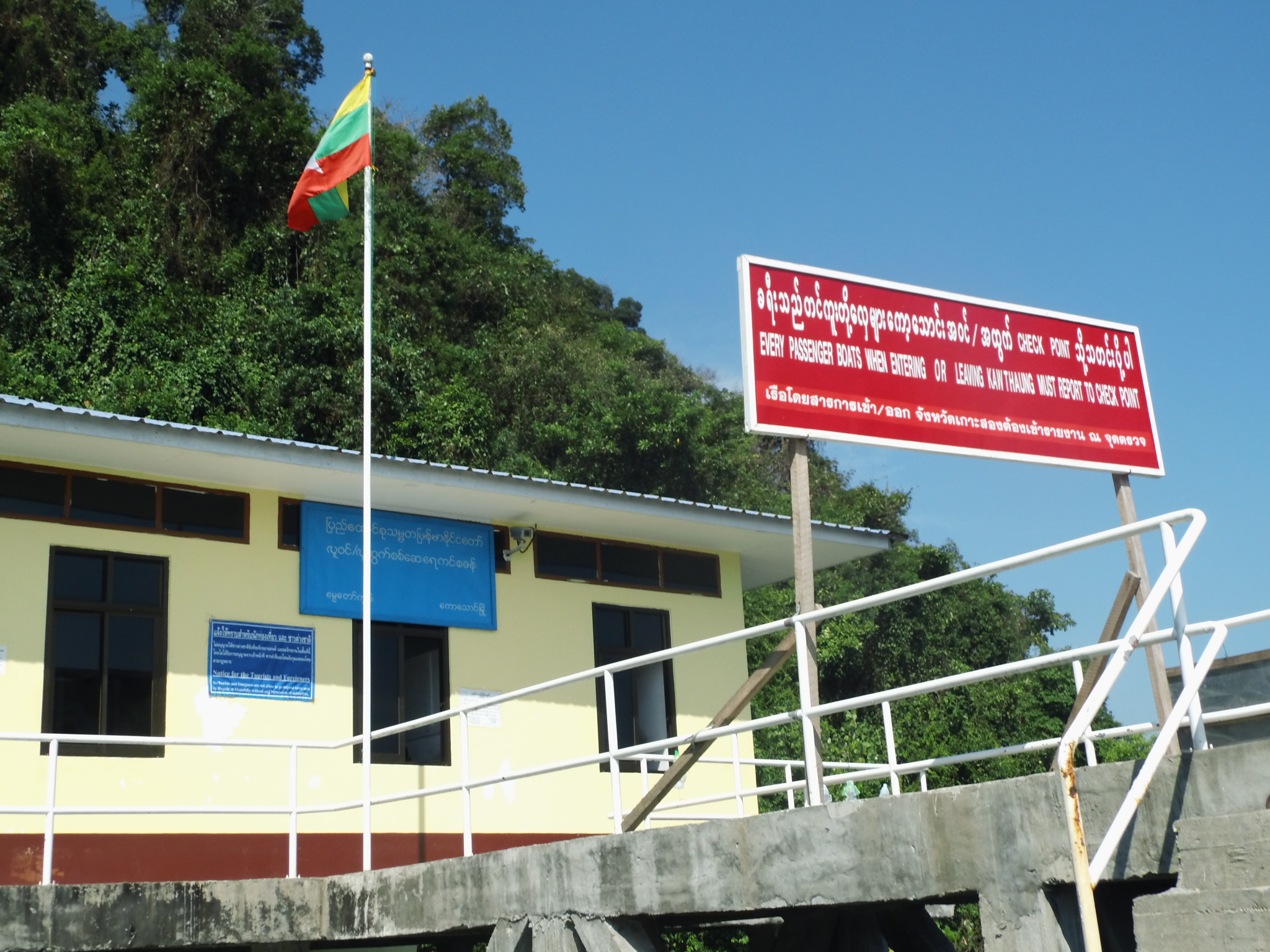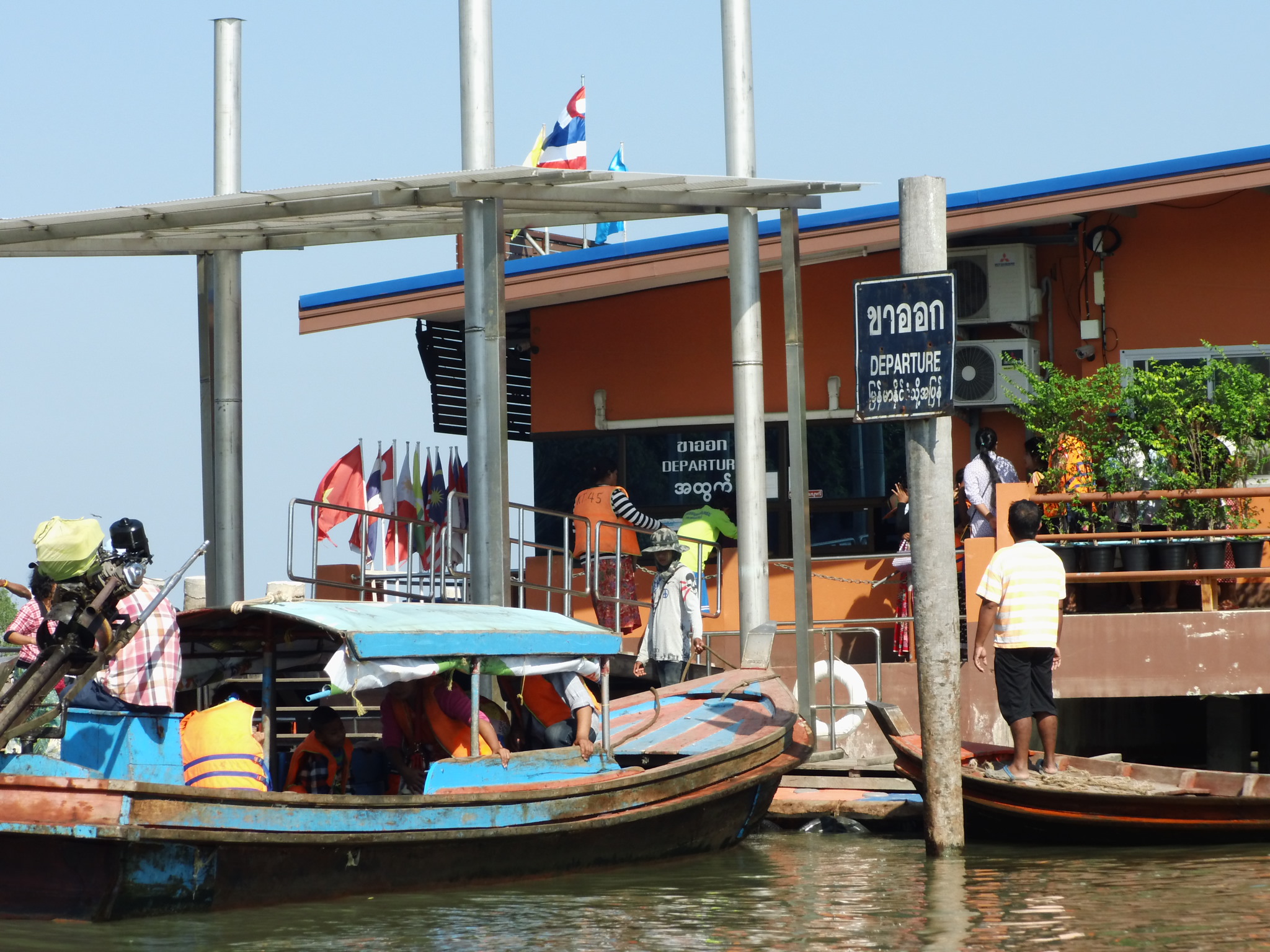 Bevor es aufs Longtailboot nach Myanmar geht, vergiss das Ausstempeln nicht. Dazu geht es zum Ausreiseschalter zu deiner rechten Hand und wenn keine Schlange ist, bist du auch in fünf Minuten durch. Geprüft wird dein Reisepass und deine Ausreisekarte und es wird ein Foto von dir gemacht. Danach gehts aufs Longtailboot, um auf dem Wasser auch noch Halt an verschiedenen Checkpoints zu machen. Einen auf thailändischer Seite, einen militärischen und noch einen auf Seiten von Myanmar, bevor es dann aufs Land geht nach Kawthaung in Myanmar. Dort gehts dann auch gleich zur Immigration, wo du endlich deine gebügelte 10 $ Dollar Note loswirst und den ein- und Ausreisestempel bekommst. 10 Minuten später gehts zurück aufs Boot. Wer noch Zigaretten oder Alkohol braucht, dem wird dies noch kostengünstig angeboten. Halte ein wenig Kleingeld, Bonbons oder Sticker für die kleinen burmesischen Kinder bereit, die dir wieder ins Boot helfen. Ich bin eigentlich ein Gegener davon, den Kindern Geld zu geben aber da es jeder tut, habe ich mich dem Gruppenzwang unterzogen und schließlich haben sie Jannik sicher über die wackeligen Boote gebracht.