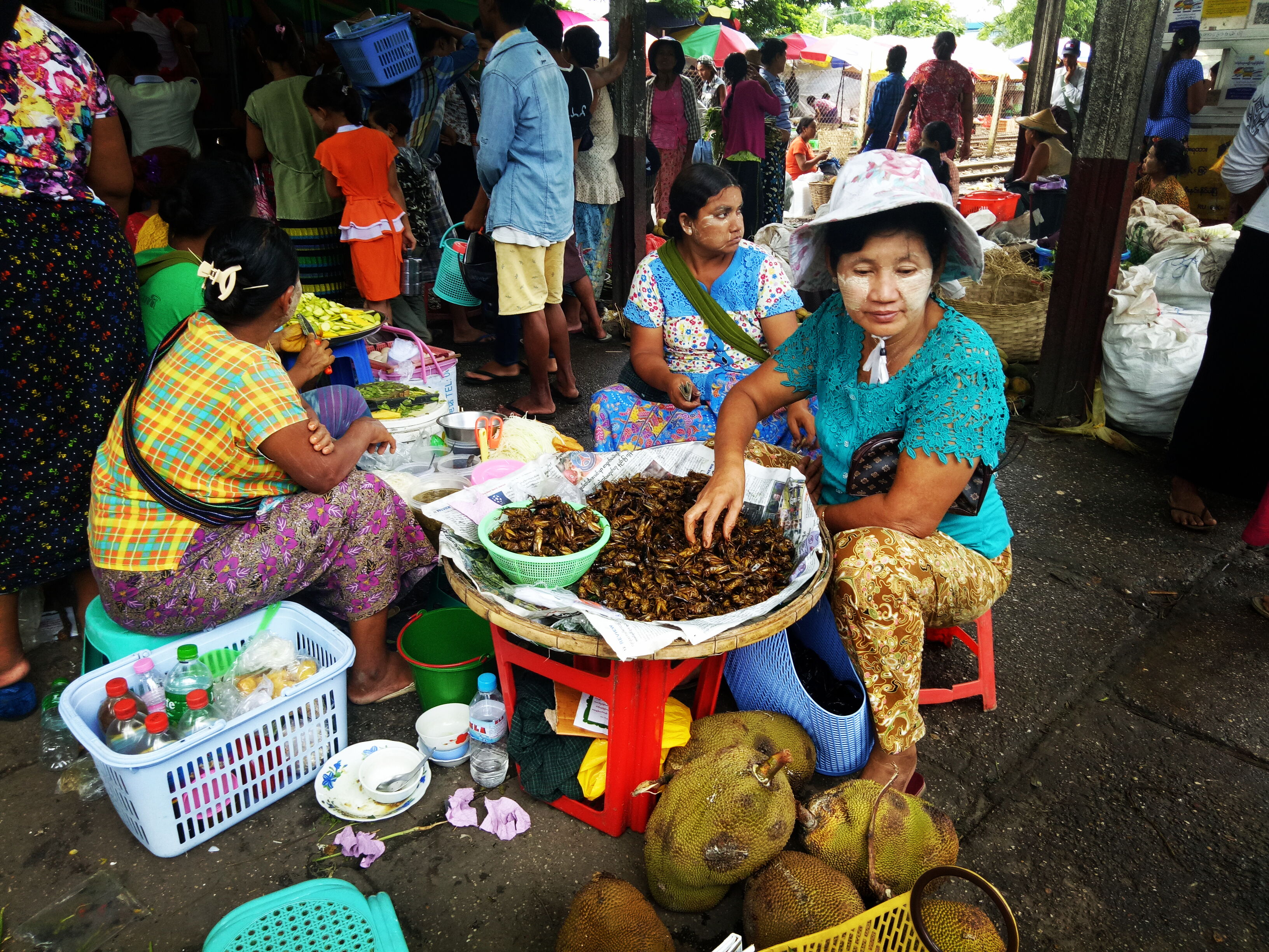 Was ich dir aber in jedem Fall ans Herz legen will, ist ungefähr auf der Hälfte der Strecke die Sation Danyingon. Dort findet jeden Vormittag ein Markt statt, auf und an den Gleisen und hier kaufen auch die Einheimischen ihr Obst und Gemüse, was sie dann in die Ringbahn schleppen, dort putzen und für den Strassenverkauf in Yangon verpacken. Du bekommst hier also in jedem Fall das günstigste Obst und Gemüse und ich freute mich hier ganz besonders, die Einheimischen mit einem kleinen Beitrag zu unterstützen. Für Jannik gab es hier zusätzlich viele kleine Geschenke. Nur die frittierten Heuschrecken hat er liebevoll abgelehnt.